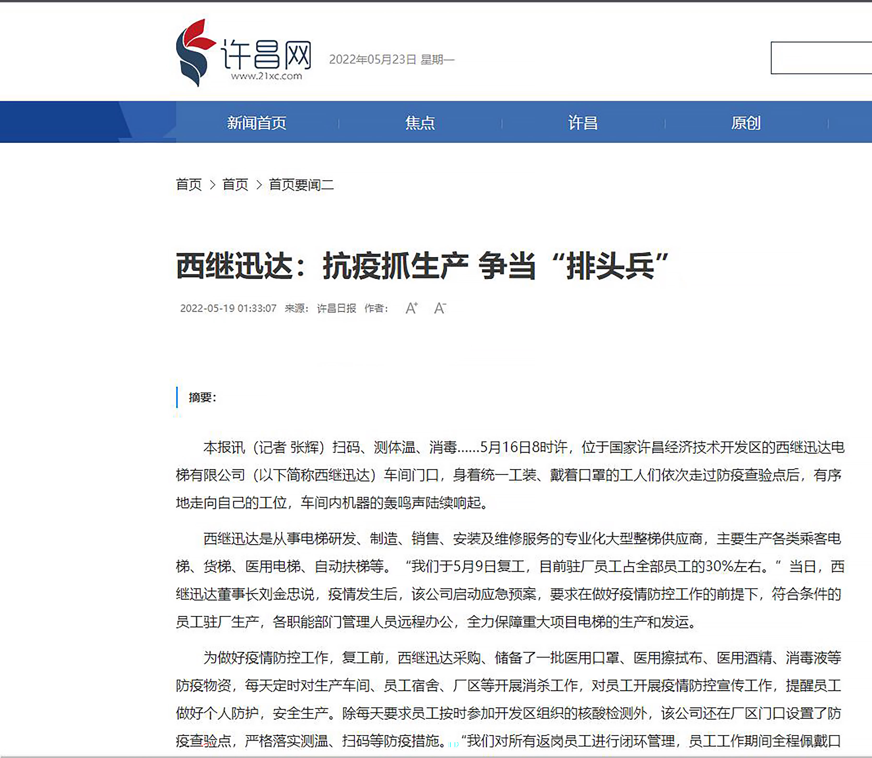 5月19日,《許昌日?qǐng)?bào)》頭版頭條發(fā)布稿件:西繼迅達(dá):抗疫抓生產(chǎn)爭(zhēng)當(dāng)“排頭兵”,對(duì)公司疫情防控和復(fù)工復(fù)產(chǎn)情況進(jìn)行報(bào)道,在僅有30%駐廠員工的情況下,仍然圓滿保障了眾多重點(diǎn)項(xiàng)目的生產(chǎn)發(fā)運(yùn)工作。