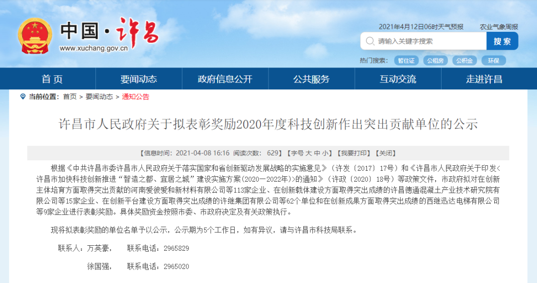 4月8日,許昌市人民政府網發布《許昌市人民政府關于擬表彰獎勵2020年度科技創新作出突出貢獻單位的公示》,西繼迅達電梯等企業擬受許昌市人民政府重獎!