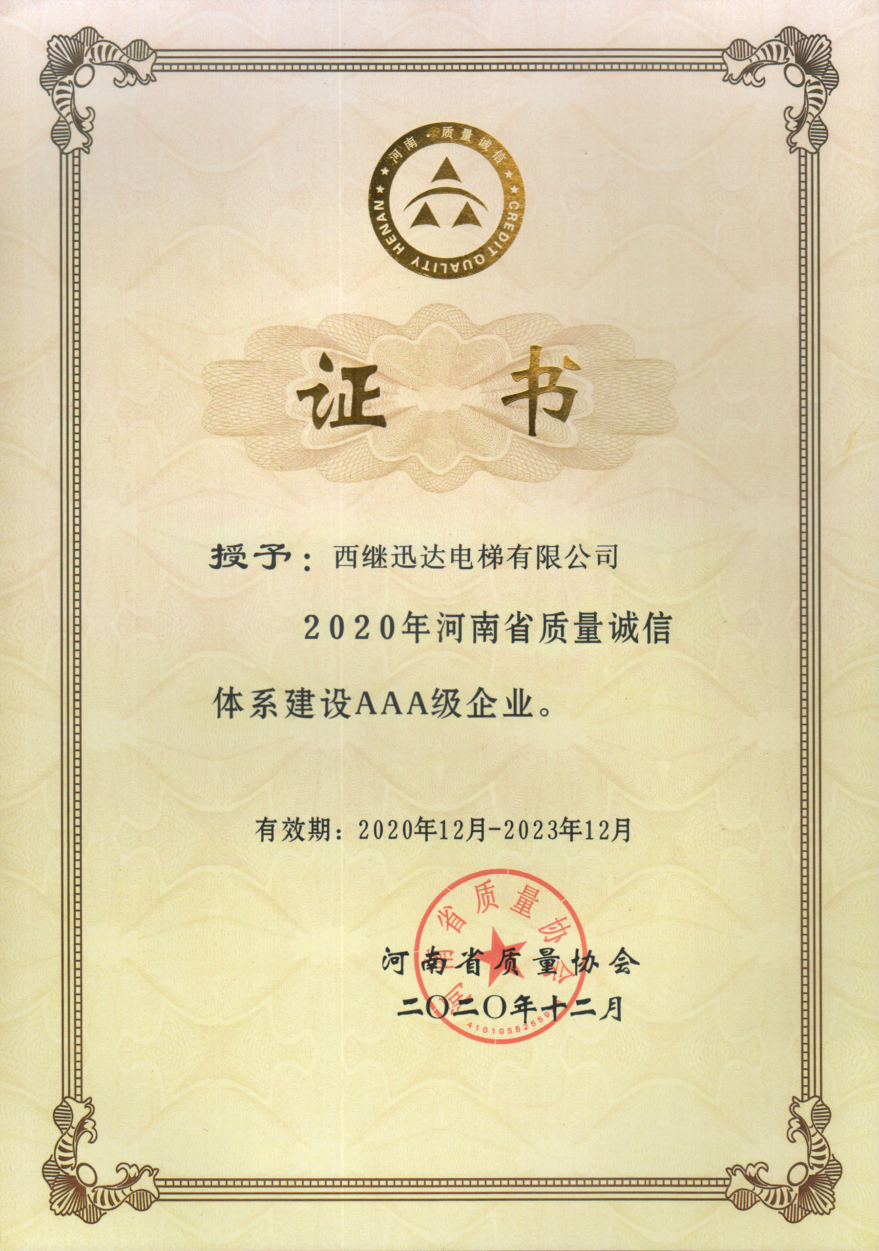河南省質(zhì)量誠信企業(yè)評估分為 AAA 級、AA級、A級企業(yè),字母數(shù)量越多,表示質(zhì)量領(lǐng)域信用水平越高。該稱號對企業(yè)自覺增強(qiáng)自身質(zhì)量誠信意識,提升產(chǎn)品質(zhì)量,增強(qiáng)企業(yè)的市場競爭力有極大的促進(jìn)作用。西繼迅達(dá)是于2015年12月份被河南省質(zhì)量技術(shù)監(jiān)督管理局認(rèn)定為“河南省質(zhì)量誠信AAA級企業(yè)”,2018年通過復(fù)評審。2020年下半年,公司積極籌備復(fù)評審相關(guān)資料,通過上報復(fù)審資料、質(zhì)量誠信等級評估、專家最終審核等程序,最后省質(zhì)量協(xié)會認(rèn)定西繼迅達(dá)信用良好,相關(guān)評價較高,產(chǎn)品質(zhì)量穩(wěn)定,持續(xù)認(rèn)定為AAA級企業(yè)等級。