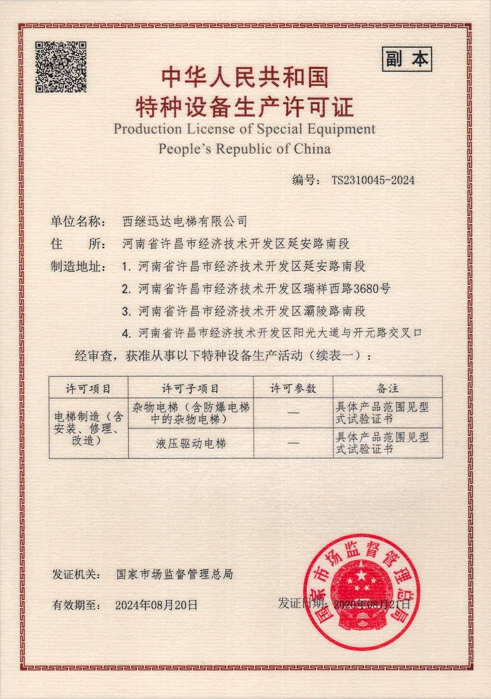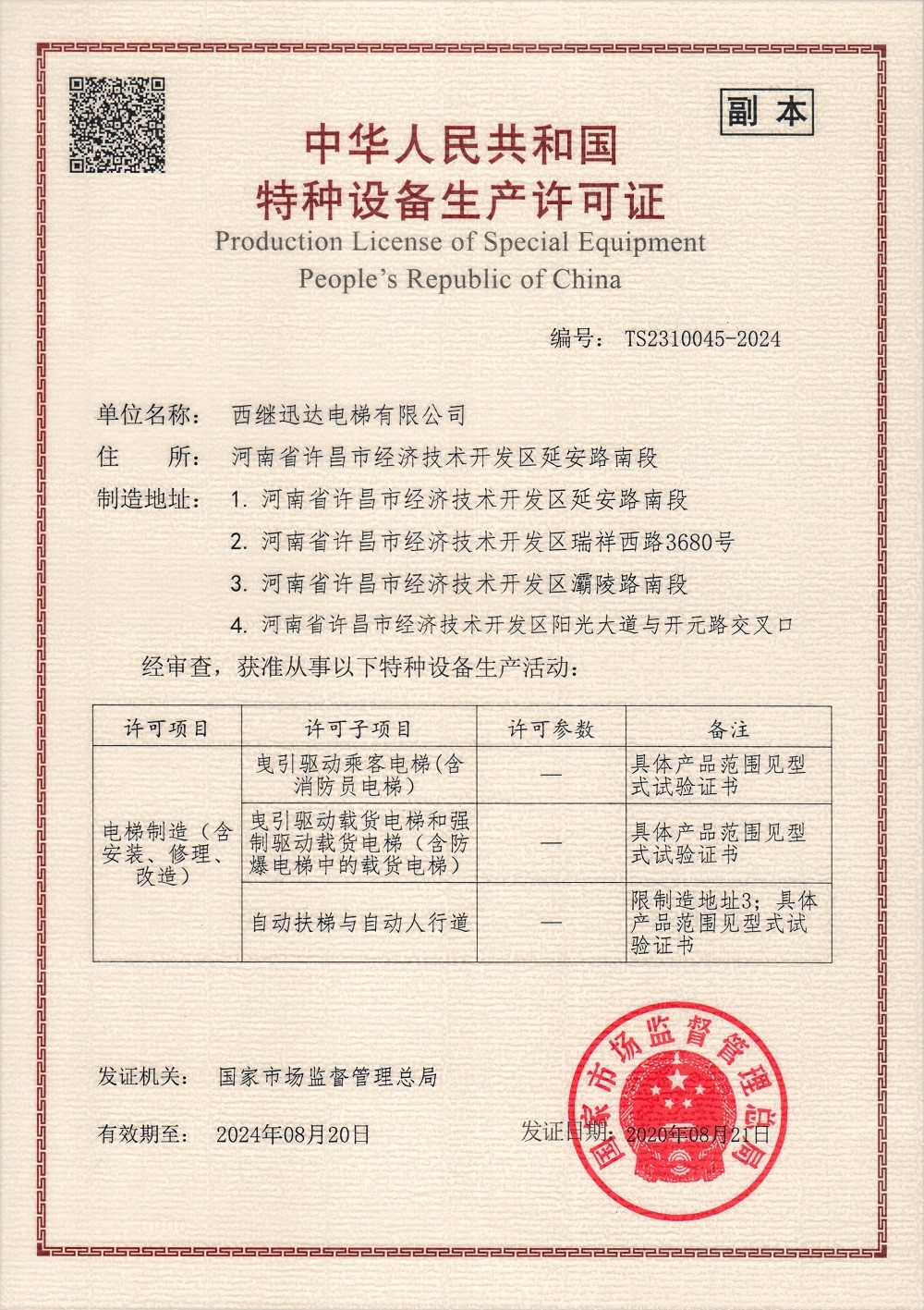 8月21日,國家市場監督管理總局為西繼迅達電梯換發特種設備生產許可證。證書編號:TS2310045-2024,證書有效期至2024年8月20日。