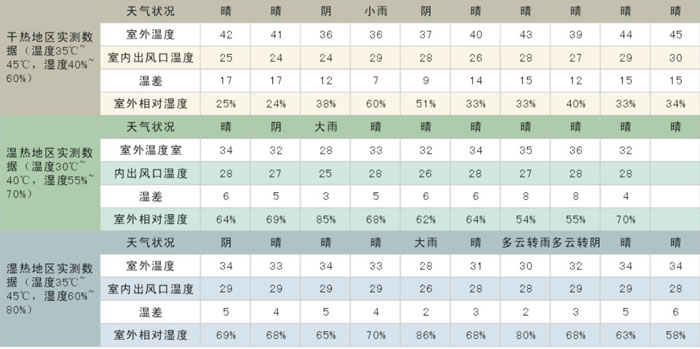 冷風機(又叫環保空調或者水空調)降溫原理是:當風機運行時進入腔內產生負壓,使機外空氣流過多孔濕潤的濕簾表面迫使過簾空氣的干球溫度降至接近于機外空氣的濕球溫度,即冷風機出口的干球溫度比室外干球溫度低5-12℃(干熱地區可達15℃),空氣愈干熱,其溫差愈大,降溫效果越好。由于空氣始終是從室外引進室內,(這時候叫正壓系統)所以能保持室內空氣的新鮮;這樣子說起來大家還是沒有直觀的認識和了解,凱美恒特意制作了在不同條件下冷風機的降溫效果數據表如下: