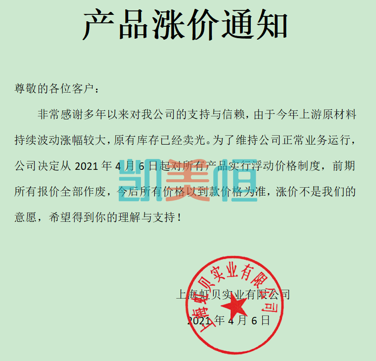 非常感謝多年以來對我公司的支持與信賴,由于今年上游原材料持續波動漲幅較大,原有庫存已經賣光。為了維持公司正常業務運行,公司決定從202146日起對所有產品實行浮動價格制度,前期所有報價全部作廢,今后所有價格以到款價格為準,漲價不是我們的意愿,希望得到你的理解與支持!
